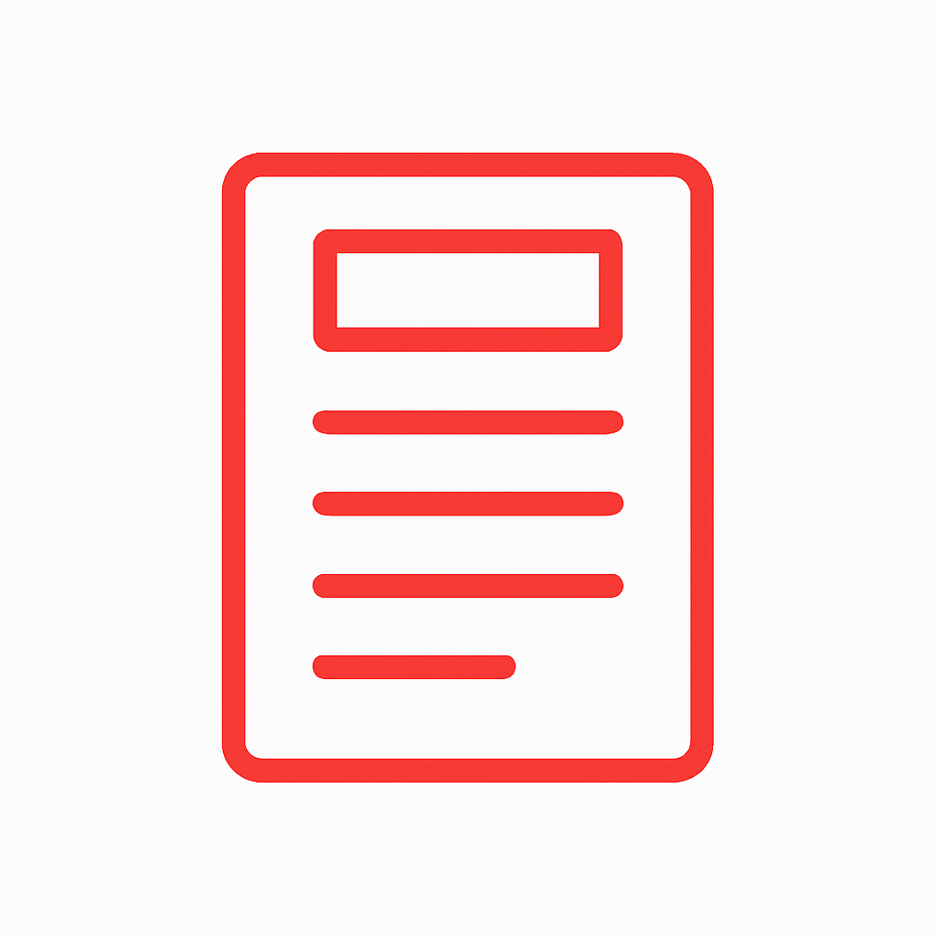 • Red outline of a document or paper with lines representing text and a rectangular area at the top, on a white background.